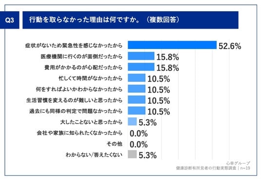 Q2で「特に何もしていない」と回答した方に、「Q3.行動を取らなかった理由は何ですか。(複数回答)」(n=19)と質問したところ、「症状がないため緊急性を感じなかったから」が52.6%、「医療機関に行くのが面倒だったから」が15.8%、「費用がかかるのが心配だったから」が15.8%という回答となりました。
