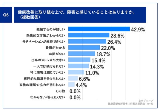 Q5で「特にない」以外を回答した方に、「Q6.健康改善に取り組む上で、障害と感じていることはありますか。(複数回答)」(n=91)と質問したところ、「継続するのが難しい」が42.9%、「効果的な方法がわからない」が28.6%、「モチベーションが維持できない」が26.4%という回答となりました。