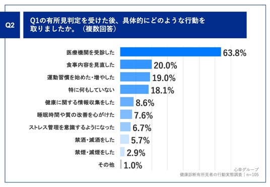Q1で「答えたくない」以外を回答した方に、「Q2.Q1の有所見判定を受けた後、具体的にどのような行動を取りましたか。(複数回答)」(n=105)と質問したところ、「医療機関を受診した」が63.8%、「食事内容を見直した」が20.0%、「運動習慣を始めた・増やした」が19.0%という回答となりました。