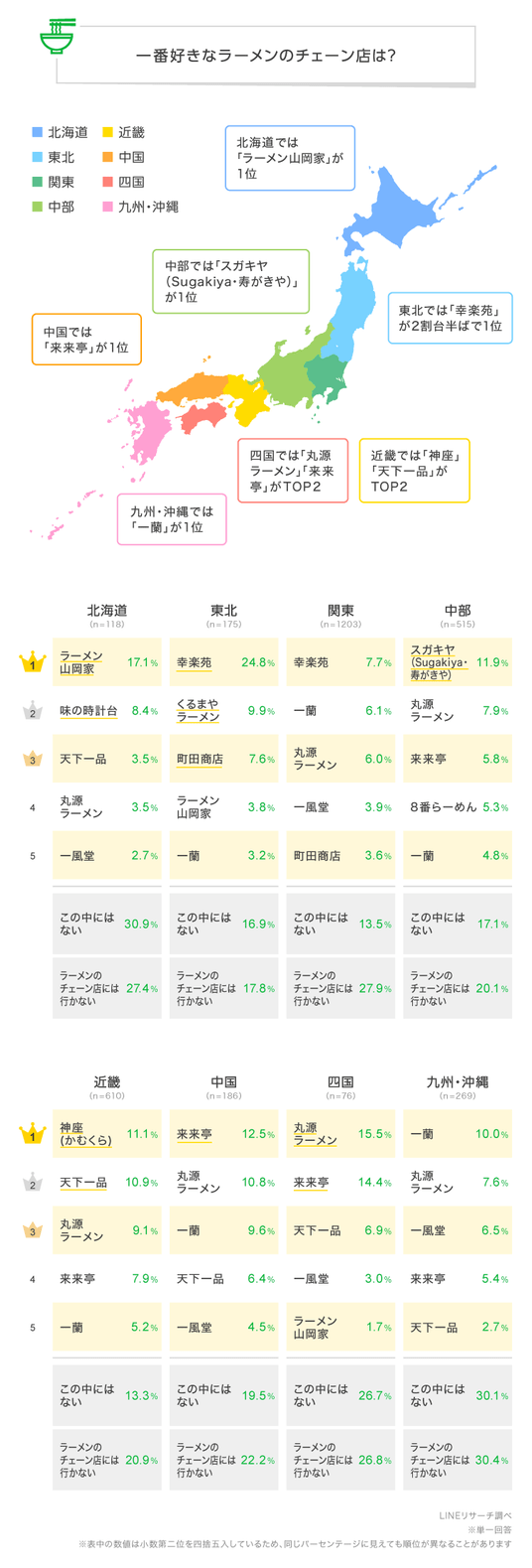 LINEリサーチ、全国の15~69歳の男女を対象に、一番好きなラーメンのチェーン店に関する調査を実施