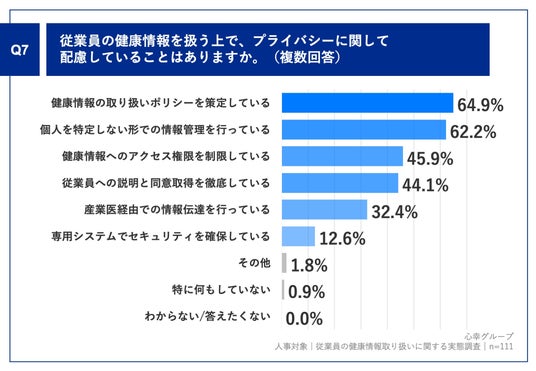「Q7.従業員の健康情報を扱う上で、プライバシーに関して配慮していることはありますか。(複数回答)」(n=111)と質問したところ、「健康情報の取り扱いポリシーを策定している」が64.9%、「個人を特定しない形での情報管理を行っている」が62.2%、「健康情報へのアクセス権限を制限している」が45.9%という回答となりました。