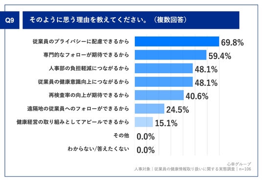 Q8で「非常に必要だと思う」「やや必要だと思う」と回答した方に、「Q9.そのように思う理由を教えてください。(複数回答)」(n=106)と質問したところ、「従業員のプライバシーに配慮できるから」が69.8%、「専門的なフォローが期待できるから」が59.4%、「人事部の負担軽減につながるから」が48.1%という回答となりました。