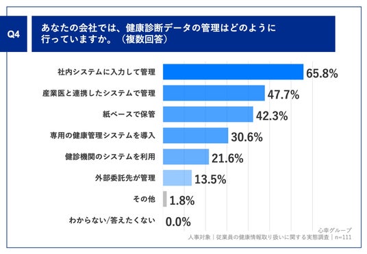 「Q4.あなたの会社では、健康診断データの管理はどのように行っていますか。(複数回答)」(n=111)と質問したところ、「社内システムに入力して管理」が65.8%、「産業医と連携したシステムで管理」が47.7%、「紙ベースで保管」が42.3%という回答となりました。