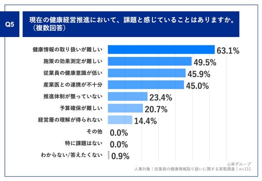 「Q5.現在の健康経営推進において、課題と感じていることはありますか。(複数回答)」(n=111)と質問したところ、「健康情報の取り扱いが難しい」が63.1%、「施策の効果測定が難しい」が49.5%、「従業員の健康意識が低い」が45.9%という回答となりました。