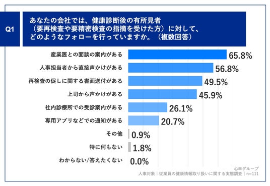 「Q1.あなたの会社では、健康診断後の有所見者(要再検査や要精密検査の指摘を受けた方)に対して、どのようなフォローを行っていますか。(複数回答)」(n=111)と質問したところ、「産業医との面談の案内がある」が65.8%、「人事担当者から直接声かけがある」が56.8%、「再検査の促しに関する書面送付がある」が49.5%という回答となりました。