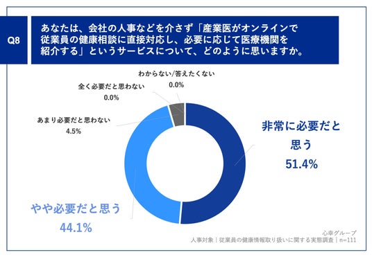 「Q8.あなたは、会社の人事などを介さず「産業医がオンラインで従業員の健康相談に直接対応し、必要に応じて医療機関を紹介する」というサービスについて、どのように思いますか。」(n=111)と質問したところ、「非常に必要だと思う」が51.4%、「やや必要だと思う」が44.1%という回答となりました。