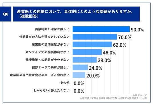 Q5で「産業医との連携が不十分」と回答した方に、「Q6.産業医との連携において、具体的にどのような課題がありますか。(複数回答)」(n=50)と質問したところ、「面談時間の確保が難しい」が90.0%、「情報共有の方法が確立されていない」が70.0%、「産業医の訪問頻度が少ない」が62.0%という回答となりました。