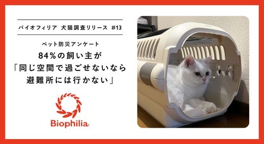 「すべてのどうぶつのいのちの尊厳が守られる新しい歴史をつくる」をミッションに、多くの会員さまとその大切なワンちゃん・ネコちゃんのいのちを守る企業として、防災に関する飼い主さまの現状や意向、同行避難に関する課題点を発信することで、少しでも人とペットの災害対策が前進することを目的とし、【バイオフィリア犬猫調査リリース#13】を発表しました。