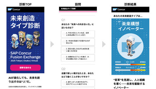 診断結果でパーソナライズ診断とイベントコンテンツを連動させることで、参加者一人ひとりに最適化された価値提案を実現しています。