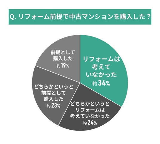 最も多いのは「リフォームは考えていなかった」で約33%を占めています。一方で、何らかの形でリフォームを意識して購入した人(「どちらかというと前提として購入した」「前提として購入した」の合計)は42%となっており、約4割の購入者がリフォームを視野に入れていたことが分かります。
