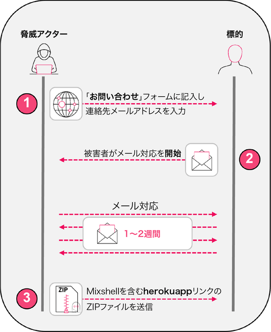 - 攻撃者は通常のフィッシングとは逆転した手順を取り、最初の接触を企業が公開している問い合わせフォームを通じて行うことで、被害者側からメールのやり取りを開始するよう仕向けます。