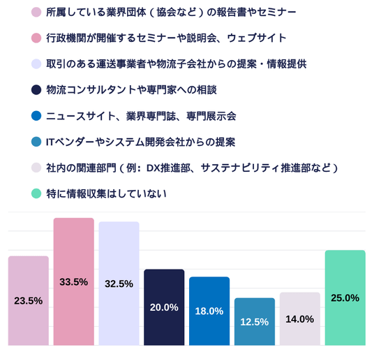 出典:【荷主企業の物流実態調査】物流DXの情報収集、トップ3は「行政」「運送会社」「業界団体」。一方で4社に1社は「特に情報収集せず」。