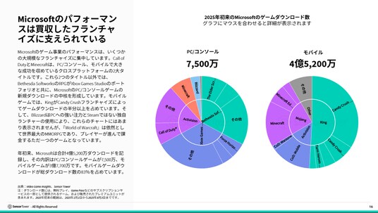 今年のMicrosoftの好調な実績は、主にCall of DutyやMinecraftといった買収したフランチャイズによってもたらされています。これらはクロスプラットフォームで大きなヒットとなっています。PC/コンソールゲームでは、BethesdaとXbox Games Studiosがダウンロードの大半を占め、モバイルではKingが全ダウンロードの半数以上を占めています。