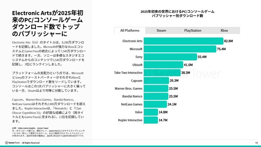 Electronic Arts(EA)は、スポーツやIPフランチャイズの成功に加え、『Split Fiction(スプリット・フィクション)』や『It Takes Two』といった協力プレイ型ゲームのヒットによって、今年これまでのダウンロード数でトップパブリッシャーとなっています。MicrosoftとSonyはそれぞれ2位、3位につけており、各社独自のPC/コンソールフランチャイズを展開しています。プラットフォーム別に見ると、PlayStationではSonyのコンテンツが、XboxではMicrosoftのコンテンツが優位性を示しています。MicrosoftのゲームがXboxで高いダウンロード数を記録している要因の一つは、Game Passとの強力な連携にあります。