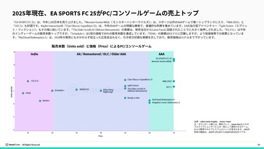 AAAタイトルに関しては、『EA SPORTS FC 25』や『NBA 2K25』といったスポーツゲームが支配的な地位を占めており、アクションRPGのヒット作『Monster Hunter Wilds(モンスターハンターワイルズ)』も人気を博しています。AAゲームでは、『Clair Obscur: Expedition 33』が圧倒的な強さを見せており、批評家からも高い評価を得ています。このターン制RPGは、今年これまでのダウンロード数で『NBA 2K25』を上回っています。インディーゲーム分野では、『R.E.P.O.』が最多の販売本数を記録しています。これはコンテンツクリエイターやフレンドグループの間で人気を博していることを考えれば驚くべきことではありません。ただし、販売本数で2位のインディーゲーム『Schedule I』は、『R.E.P.O.』の2倍の価格設定にもかかわらず、同等のダウンロード実績を達成しています。