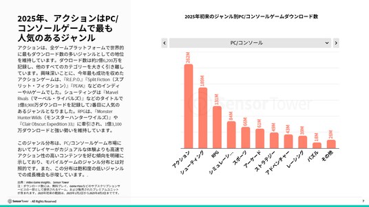 ジャンル別での人気を見ると、PC/コンソールプレイヤーの間では定番ジャンルが依然として強さを見せています。2025年のこれまでのダウンロード数では、アクションゲーム(2億6,200万)、シューティング(1億8,900万)、RPG(1億3,100万)が最も人気を集めています。