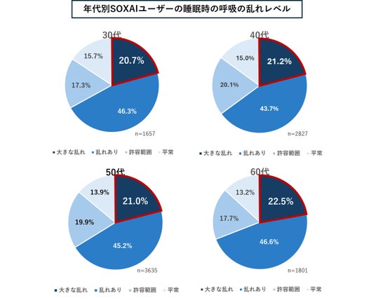 年代別にデータを分析したところ、30代以上のユーザーにおいて、その20%以上で睡眠時呼吸に「大きな乱れ」が確認され、睡眠時の呼吸状態に何らかのリスクがあることがわかりました。リスクのある方の割合は30代から60代を比べても大きな差がないこともわかりました。