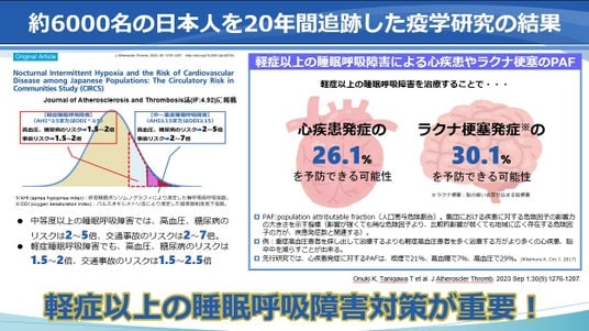 また、我々の約20年間の大規模調査により、軽症のSAS(現在は健康保険の治療対象にならない場合)であっても、脳梗塞や虚血性心疾患など循環器疾患の発症リスクが高まることを報告しています。※1 特に心疾患に関しては、喫煙の人口寄与危険割合(Population Attributable Fraction:PAF)※2 が21%であるのに対して、SASの PAF は26.1%とより高い値であり、心疾患発症への影響として、SASは喫煙に匹敵する、もしくは上回ることが示されました。