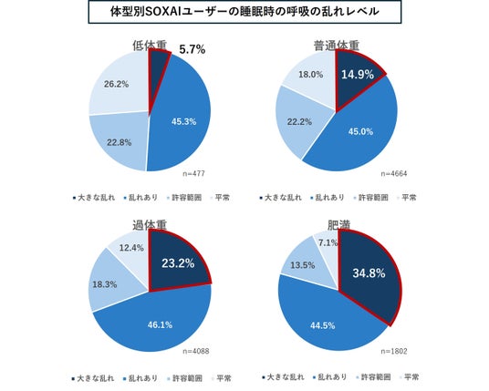 BMI値のデータから低体重・普通体重・過体重・肥満※3の4属性に分けて比較すると、肥満に近づくにつれ「大きな乱れ」の方の割合が増え、肥満のユーザーの約3人に1人(34.8%)が「大きな乱れ」に当てはまることが明らかになりました。一方で、普通体重とされる方の中でも約15%が「大きな乱れ」に該当し、BMI値が正常値であっても睡眠時の呼吸が乱れている可能性が示されました。