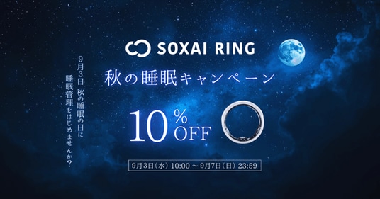 睡眠課題を感じてSOXAI RINGを購入される方を応援するため、9月3日「秋の睡眠の日」にあわせて、SOXAI RINGを全品10%オフで購入できるキャンペーンを実施いたします。