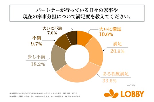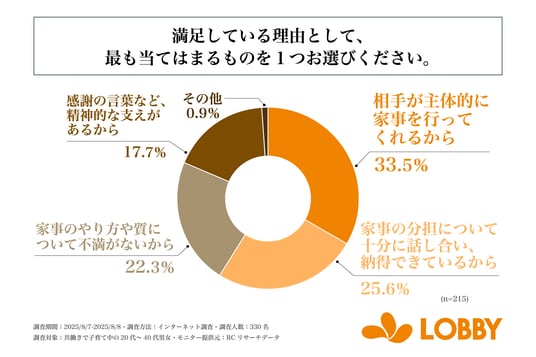 また、パートナーが行う日々の家事や家事分担に満足している(ある程度満足、満足、大いに満足)と回答した人を対象に「満足している理由として、最も当てはまるもの1つ」を尋ねる設問への回答では、1位が「相手が主体的に家事を行ってくれるから」で33.5%、2位が「家事の分担について十分に話し合い、納得できているから」で25.6%、3位が「家事のやり方や質について不満がないから」で22.3%という結果になりました。この結果から、パートナーが行う日々の家事や家事分担に満足している人の理由で最も多いのは、「相手が主体的に家事を行ってくれるから」であることが明らかになりました。