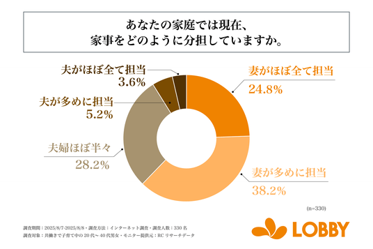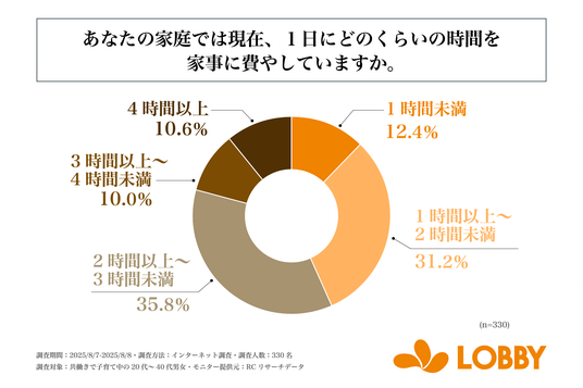 株式会社ロビー(本社:東京都新宿区、代表取締役:対馬 誉仁)が運営する「LOBBY」は、共働きで子育て中の20代~40代の男女を対象に「子育て世代の家事の実情に関する調査」を実施しました。この調査から、家事にかける時間、夫婦間の家事分担などの実態が明らかになりました。