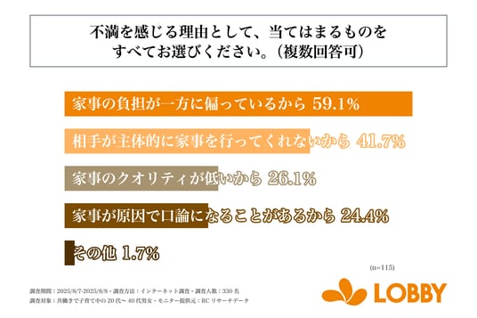 次に、パートナーが行う日々の家事や家事分担に不満がある(少し不満、不満、大いに不満)と回答した人を対象に「不満を感じる理由として、当てはまるものすべて」を尋ねる設問への回答では、1位が「家事の負担が一方に偏っているから」で59.1%、2位が「相手が主体的に家事を行ってくれないから」で41.7%、3位が「家事のクオリティが低いから」で26.1%という結果になりました。この結果から、パートナーが行う日々の家事や家事分担に不満を抱えている人の主な理由は、「家事の負担が一方に偏っているから」や「相手が主体的に家事を行ってくれないから」であることがわかりました。