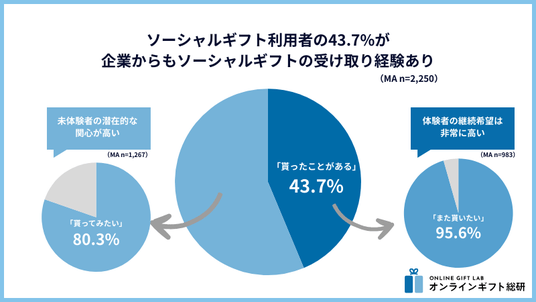 今回のレポートでのトピックは、ソーシャルギフト利用経験者の43.7%が個人のみならず企業からのギフト(以下「ビジネスギフト」)の受け取り体験があるという事実です。これまで個人間のコミュニケーションツールとしての印象が強かったソーシャルギフトは、企業の販売促進やマーケティング活動にも広く活用されていることが明らかになりました。また、企業からソーシャルギフトを受け取った経験のある人の95.6%が継続希望を示していることから、ビジネスギフトシーンにおけるソーシャルギフトの存在は今後さらなる拡大が期待されます。