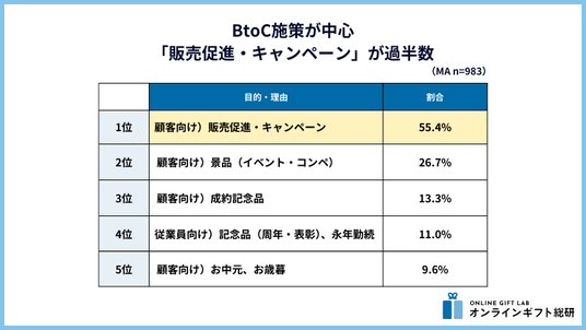 A. 1位は「販売促進・キャンペーン」で55.4%です。次いで「景品(イベント・コンペ)」26.7%、「成約記念品」13.3%となっており、顧客や取引先へのギフトの目的での利用が多くなっています。一方、従業員向けのギフトとしての利用も11.0%あり、企業によっては従業員の帰属意識の向上のためにソーシャルギフトを活用しているケースもあります。