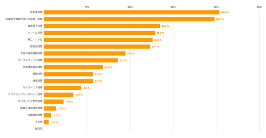 シニアの健康維持に不足していると思う栄養素や機能性成分は、1位 タンパク質、2位 食物繊維、3位 ミネラル という回答が得られました。シニアが必要な栄養素を摂取するための工夫としては、1位 摂取しやすくなるように調理を工夫する、2位 家族や仲間との共食の機会を多くつくる、3位 食生活を見直す機会をつくる、となりました。また、自身のスキルアップのためにどのような情報を得たいか、という設問では、1位低栄養対策 、2位 栄養素や機能性成分の効果・効能、3位 食欲低下対策、という結果となり、シニアの食と栄養に関わるオピニオンリーダー(プロシューマ)としての情報ニーズが明らかになりました。