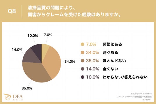 「清掃品質の問題により、顧客からクレームを受けた経験はあるか?」という質問に対し、「頻繁にある」が7.0%、「時々ある」が34.0%で、4割以上(41.0%)が顧客からクレームを受けた経験があると回答しました。
