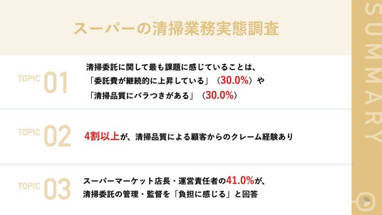 今回のアンケート調査により、清掃委託に関して「コスト上昇」と「見えない現場負担」という二重苦をスーパー経営にもたらしていることが浮き彫りになりました。