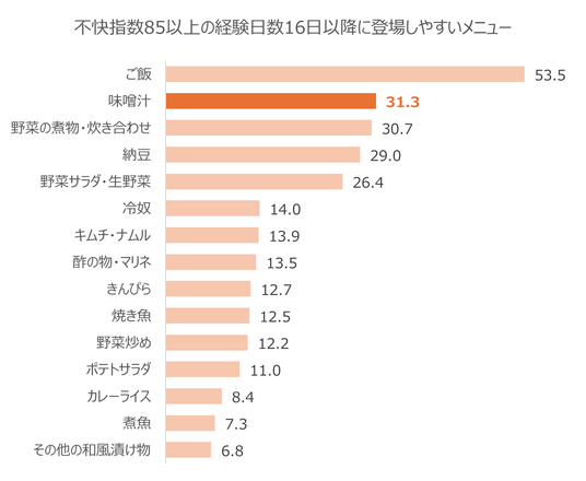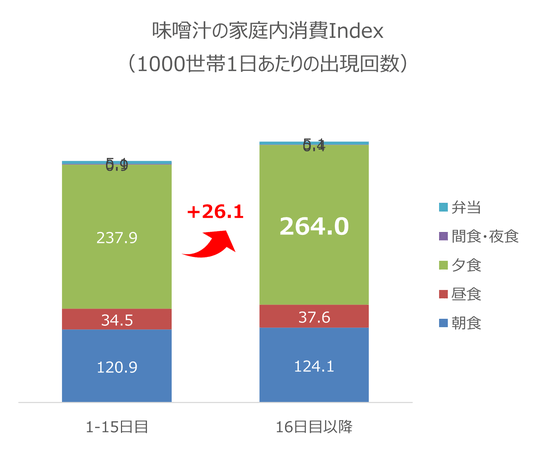 実際に「不快指数」の経験日が16日目以降の食卓では、味噌汁は夕食の出現ボリュームが増加し、一日のメインとなる食卓で重宝されており、冷房バテや冷製メニューが続いた体をいたわる役割を果たしているようです。【図表2.】
