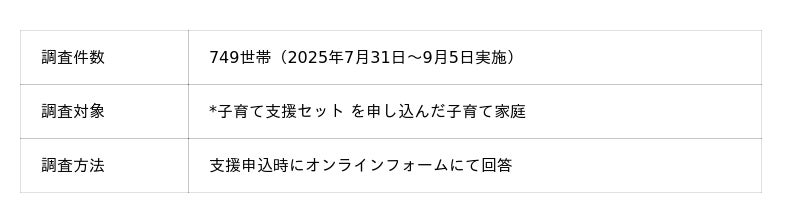 本調査は、2025年7月31日~9月5日にわたり、フードバンク愛知によって実施されました。対象は*子育て支援セット を申し込んだ子育て家庭で、749世帯のデータをオンラインフォームによって収集しました。