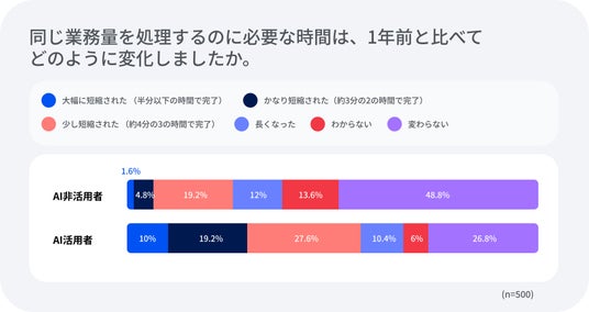 1.業務時間の短縮:AI活用者の56.8%が1年前と比べ同じ業務量を処理する時間が短縮されたと回答し、非活用者(25.6%)のおよそ2倍に上りました。
