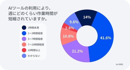 業務時間の削減についてAI活用者に聞いたところ、週「1~3時間程度」が41.6%で最も多く、次いで「3~7時間程度(21.2%)」、「1時間未満(14.0%)」と続きました。