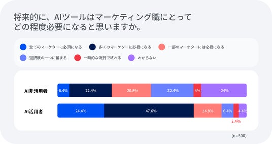 さらに、72%のAI活用者がAIツールは将来的にマーケターにとって必要になると考えており、同様に答えた非活用者28.8%に対して大きな認識の差が見られます。AIを主に補助的なツールと捉える非活用者に比べ、日々の業務にAIを取り入れているマーケターは、将来的な必要性をより強く認識していることがわかります。
