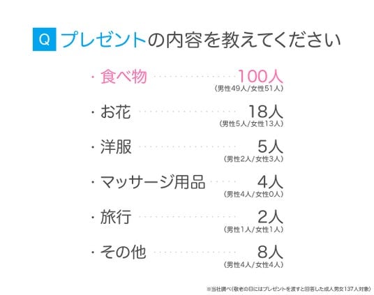 その他、「洋服」や「マッサージ用品」、「旅行」などもプレゼントに選ばれています。