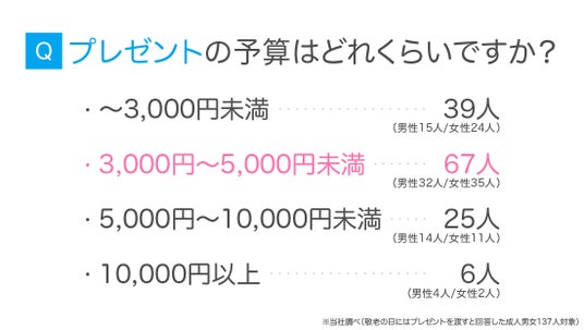 「プレゼントの予算はどれくらいですか?」と質問したところ、最も多かったのは「3,000円~5,000円未満」という回答で、全体の半数近くを占めています。