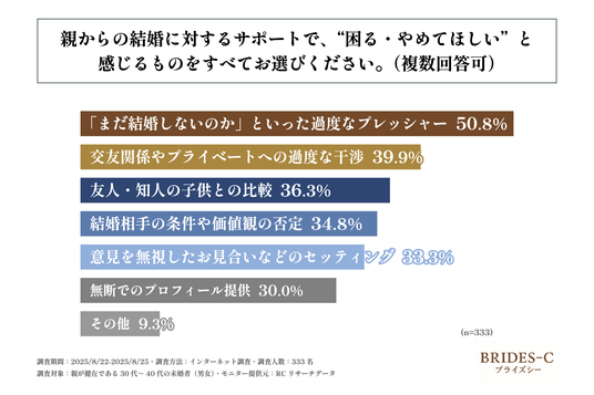 調査の最後、「親からの結婚に対するサポートで、“困る・やめてほしい”と感じるもの」を尋ねる設問への回答では、1位が「“まだ結婚しないのか”といった過度なプレッシャー」で50.8%、2位が「交友関係やプライベートへの過度な干渉」で39.9%、3位が「友人・知人の子供との比較」で36.3%という結果になりました。この結果から、親からの結婚に対するサポートで、“困る・やめてほしい”と感じるもので最も多いのは、「“まだ結婚しないのか”といった過度なプレッシャー」であることが明らかになりました。