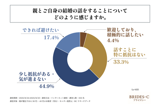 また、親と自身の結婚の話をする(たまにある、時々ある、頻繁にある)と回答した人を対象に「親とご自身の結婚の話をすることについてどのように感じるか」を尋ねる設問への回答では、1位が「少し抵抗がある・気が進まない」で44.9%、2位が「話すことに特に抵抗はない」で33.3%、3位が「できれば避けたい」で17.4%という結果になりました。1位と3位の回答を合計すると回答率60%を超える形となり、この結果から、親と自身の結婚の話をする人の60%以上が、親と自身の結婚の話をすることに「少し抵抗がある・気が進まない」または「できれば避けたい」と感じていることが明らかになりました。