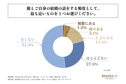 続いて、「親と自身の結婚の話をする頻度として、最も近いもの」を尋ねる設問への回答では、1位が「全くない」で51.4%、2位が「ほとんどない」で27.9%、3位が「たまにある」で14.4%という結果になりました。1位と2位の回答を合計すると回答率約8割となり、この結果から、親が健在である30代~40代の未婚者の8割弱が、親と自身の結婚についてほとんど話すことがない、または全く話すことがないことが判明しました。