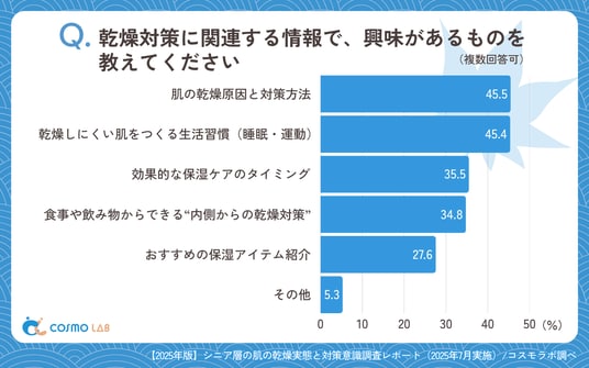「肌の乾燥原因と対策方法」(45.5%)が最多で、「乾燥しにくい肌をつくる生活習慣(睡眠・運動)」(45.4%)がほぼ同水準で、「効果的な保湿ケアのタイミング」(35.5%)が続きます。保湿アイテムの紹介よりも、根本的な乾燥のメカニズムや予防行動に関する情報ニーズが高いことが明らかです。