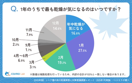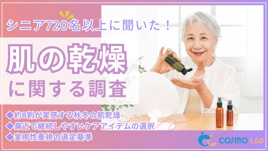 シニア専門のマーケティングプラットホーム コスモラボ(会社名:コスモヘルス株式会社、本社:東京都港区、代表取締役社長 小塚 崇史)がシニア層の『肌の乾燥実態と対策』に関するアンケートリサーチのレポートをリリースしました。本レポートでは、50歳以上のシニア層を対象に、肌の乾燥に関する意識と実態調査を実施しました。乾燥の時期・部位や、使用アイテム、ケア効果の実感、情報ニーズなど、シニア世代の肌乾燥問題と対策の実情が明らかになりました。
