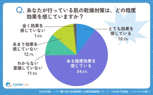 「ある程度効果を感じている」(64.6%)が最多で、「とても効果を感じている」(10.2%)と合わせると約75%が効果を実感しています。一方で「効果を感じていない」または「わからない・意識していない」は約25%を占め、効果実感にばらつきがあります。7割以上が効果を感じている結果は、現在行われている乾燥対策が一定の成果を上げていることを示しています。