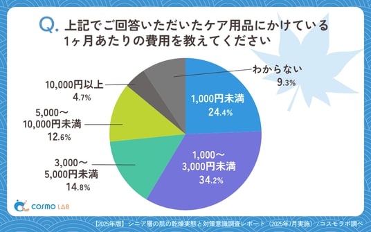 「1,000~3,000円未満」(34.2%)が最多で、「1,000円未満」(24.4%)、「3,000~5,000円未満」(14.8%)が続きます。5,000円以上(17.3%)は比較的少数で、支出は低価格帯に集中しています。約6割が月3,000円未満に収めている結果は、シニア世代が乾燥対策において費用対効果を重視する堅実な消費行動を取っていることを示しています。