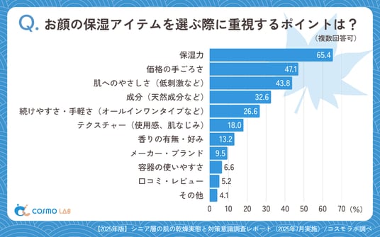 保湿アイテム選びでは「保湿力」(65.4%)や、「価格の手ごろさ」(47.1%)、「肌へのやさしさ(低刺激など)」(43.8%)が上位を占め、効果・価格・安全性のバランスを重視しています。シニア世代は製品選択において機能性と経済性の両立を求める傾向が強く、確実な効果を適正価格で得られる製品への選好が明確に表れています。