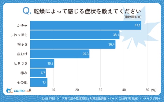 「かゆみ」(47.4%)が最多で、「しわっぽさ」(38.1%)や、「粉ふき」(36.4%)、「皮むけ」(25.3%)が続きます。身体の状態の変化に加えて、感覚的な不快症状も一定数見られ、乾燥が複合的な問題として存在していることが明らかです。