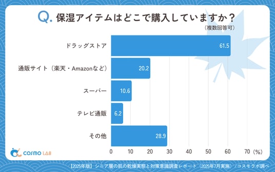 製品選択基準では「保湿力」(65.4%)が最重要視され、「価格の手ごろさ」(47.1%)、「肌へのやさしさ」(43.8%)が続くことから、効果・価格・安全性のバランスを重視する実用主義的な傾向が顕著です。購入場所は「ドラッグストア」(61.5%)が圧倒的で、実店舗での確認と即時購入を重視しています。