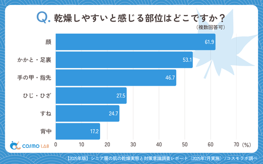 「顔」(61.9%)が最多で、「かかと・足裏」(53.1%)や、「手の甲・指先」(46.7%)が続き、「ひじ・ひざ」(27.5%)や、「すね」(24.7%)、「背中」(17.2%)と続きます。露出部位や摩擦が生じやすい部位に乾燥を感じやすい傾向が明確です。